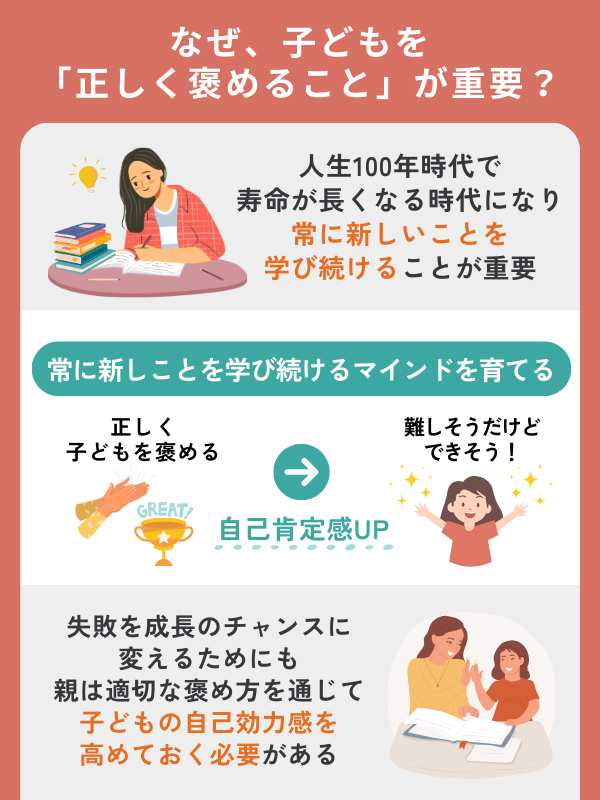また現代社会では、失敗は貴重な学びの機会であるという考えが浸透しはじめています。失敗を成長のチャンスに変えるためにも、親は適切な褒め方を通じて子どもの自己効力感を高めておく必要があります。